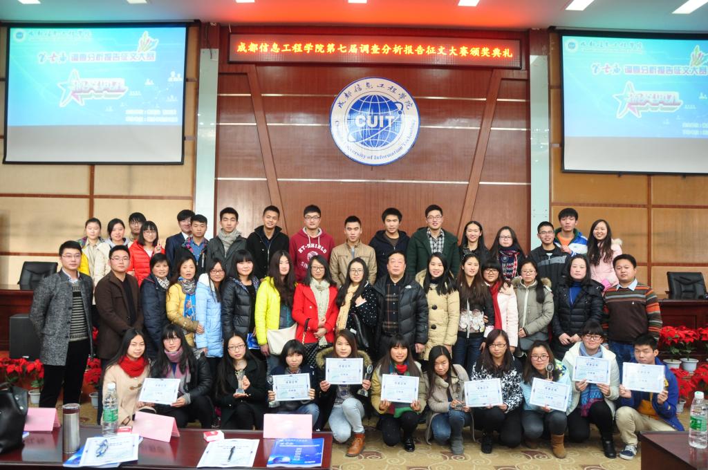 成都信息工程学院第七届调查分析报告征文大赛颁奖典礼于12月19日下午2:00在我校龙泉校区学术报告厅顺利举行。Betway体育西汉姆联党总支书记刘全教授、校团委胡敏老师、Betway体育西汉姆联彭莉莎教授、龙泉校区各学院分团委书记、Betway体育西汉姆联辅导员老师出席参加了此次颁奖典礼。