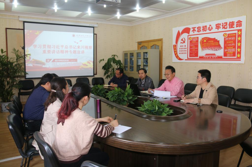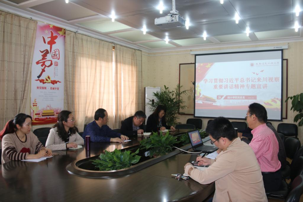 孙克常首先传达了学校党委和省委教育工委文件精神(成信党委发〔2018〕38号;川教工委函〔2018〕17 号),介绍了习近平总书记来川视察的基本情况,认真学习了习近平总书记所到之处的讲话精神,传达了总书记和党中央对全省各族人民的深切关怀,宣讲了习近平总书记对做好新形势下四川工作的总体要求和抓好党的十九大精神贯彻落实、推动经济高质量发展、打好精准脱贫攻坚战、实施乡村振兴战略、着力保障和改善民生、加强党的政治建设的重要要求。