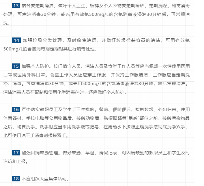 日前,国务院应对新型冠状病毒肺炎疫情联防联控机制印发《关于依法科学精准做好新冠肺炎疫情防控工作的通知》,并以附件形式发布了托幼机构新冠肺炎防控技术方案、中小学校新冠肺炎防控技术方案、大专院校新冠肺炎防控技术方案,方案重点对开学前的准备、开学后的卫生防护以及出现疑似感染症状应急处置等提出了技术要求。