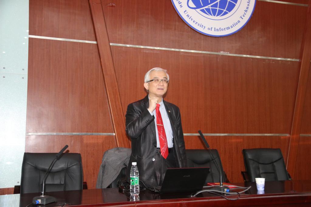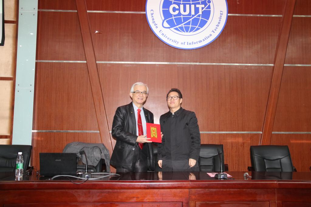 谢邦昌教授为我校客座教授,讲座开始前,于世祥向谢邦昌颁发了成都信息工程大学客座教授续聘聘书。