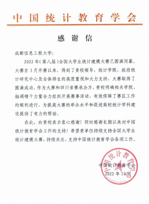 2022年10月,我校收到来自中国统计教育学会的感谢信,中国统计教育学会特致函感谢我校对2022年(第八届)全国大学生统计建模大赛承办工作的帮助以及长期以来对学会工作的支持。