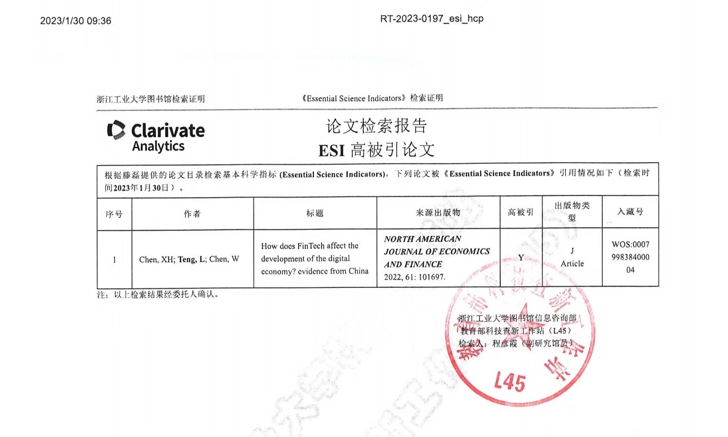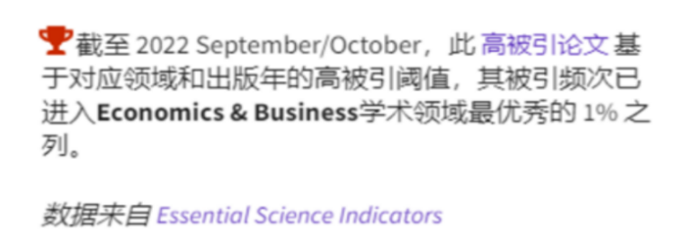 据悉,基本科学指标数据库(简称ESI)是美国科技信息研究所(ISI2001年推出的科学研究绩效、学科发展趋势的评价工具,是汤森路透基于SCI(科学引文索引)和SSCI(社会科学引文索引)收录的全球11000多种学术期刊的1000多万条文献记录而建立的数据库。当前,ESI已成为当今世界范围内普遍用来评价高校、学术机构、国家/地区国际学术水平及影响力的重要评价指标工具。据ESI数据库的界定,高被引论文是同一年同一个ESI学科中发表的所有论文按被引用次数由高到低进行排序,排在前1% 的论文。通俗来讲,就是在同一年中的同一个ESI学科中的被引用最多的,排在最前面的高水平论文。