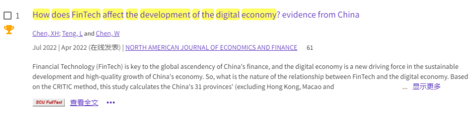 近日,根据ESI(Essential Science Indicators)公布的最新数据,我院副院长滕磊教授作为通讯作者在国际知名期刊《North American Journal of Economics and Finance》(SSCI)发表的有关数字经济的论文《How does FinTech affect the development of the digital economy? evidence from China》成功入选全球前1% ESI高被引论文。该文的共同作者还包括宜宾学院陈小辉博士,南京农业大学陈文副教授(之前任职于西南财经大学)。