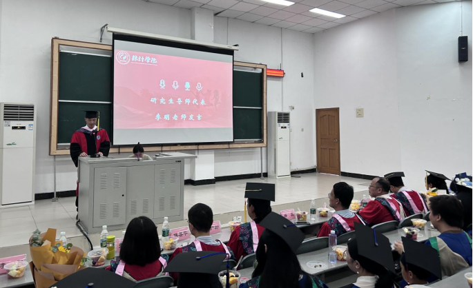研究生导师代表李明老师分享了自己与学生共同度过的难忘时光,表达了对学生的深厚情谊,并对学生们的未来充满期待。