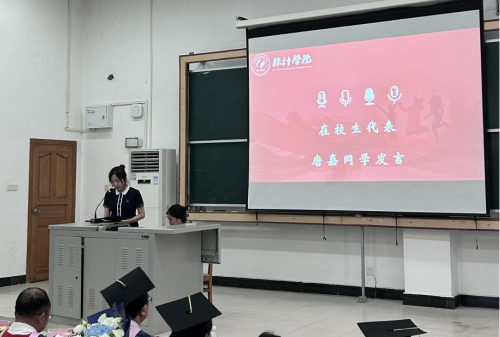 2023级农发专业唐嘉代表在校生发言。她向辛勤付出的老师们表达敬意,向即将毕业的学长学姐们送上诚挚的祝福,祝愿学长学姐们未来能够乘风破浪、勇往直前,实现自己的梦想,并期待学院因所有成信统计人的精彩更加辉煌。