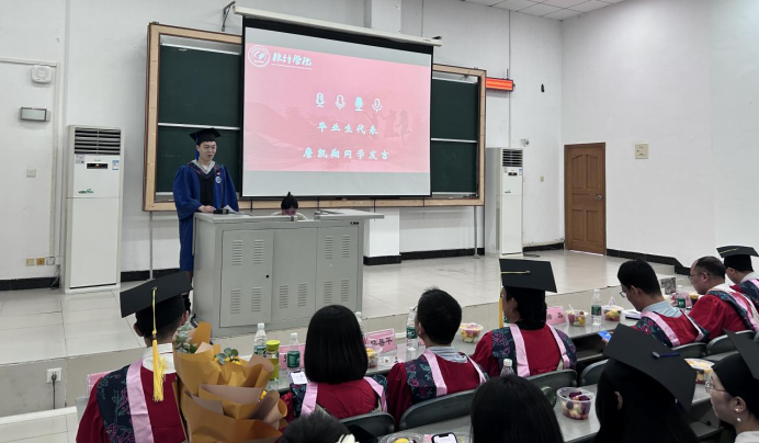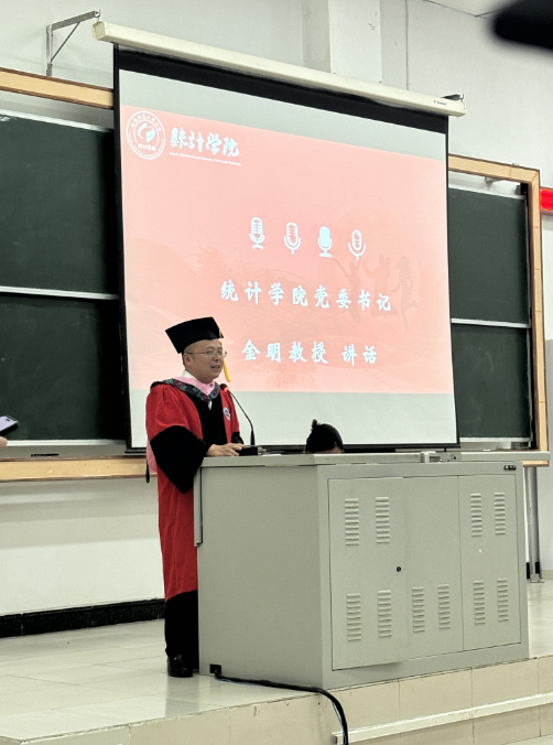 金明书记向学有所成、即将迈向人生新阶段的统计学子们送上诚挚的祝贺和美好的祝福。他以分享本院本届3位优秀毕业生的案例来引出学院致力于全员全程全方位进行人才培养的重要性:本科和研究生期间,始终保持对学习的激情和热爱,硕士期间连续三年学习成绩名列专业第一,多次获得国家级、省级科研奖项,并在研三获得了国家奖学金和四川省优秀毕业生两份殊荣的吴丹同学、在读研期间认真学习,积极参与导师的课题,并通过重重挑战,考上了西南财经大学理论经济学方向的博士生,继续追求学术梦想的龙一萍同学、已年满50岁继续保持学习的激情状态并收获人生“大四喜”(研究生顺利毕业、顺利退休、顺利考上西部计划、儿子高考取得高分)的王雪同学。他深情寄语2024届研究生们继续保持学习热情的重要性,鼓励毕业生们无论选择深造还是步入职场,都要保持对知识的渴望和追求,不断进步,学会感恩,珍惜身边的每一个人和每一次机会。他祝愿大家在未来的道路上勇往直前,为推进中国式现代化建设贡献统计学子的智慧和力量,学院是统计学子们永远的坚实后盾。