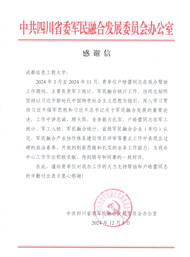 近日,中共四川省委军民融合发展委员会办公室向我校发来感谢信,对我校在2024年3月-11月委派的户晗蕾老师在军工统计和军民融合统计工作方面给予的支持表达感谢。