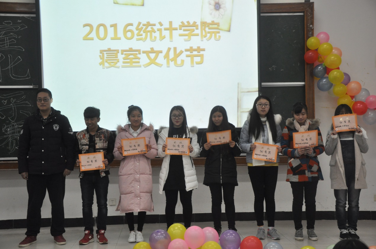 最终由评委根据游戏、走寝评分、风采大赛三个环节综合评分选出了本次大赛的冠军,第一名由6—204寝室获得,第二名和第三名分别由4-107和6—118获得。其余7个寝室均获得了优秀奖,最后由学生会主席朱茜和分团委副书记杨露为奖选手颁奖,并合照留念。
