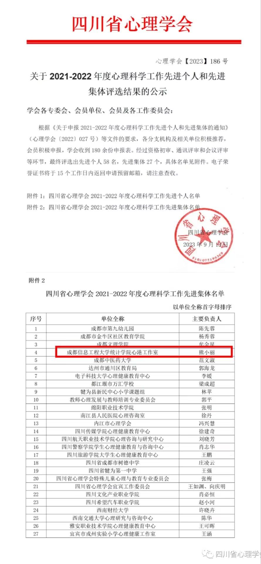 9月13日,四川省心理学会发布了2021-2022年度心理科学工作先进个人和先进集体名单,本次评选出了先进个人58名,先进集体27个。我院辅导员熊小丽荣获先进个人荣誉称号,Betway体育西汉姆联心港工作室荣获先进集体荣誉称号。