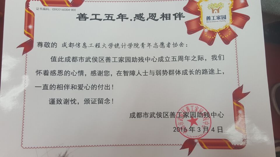 201634日,值此成都市武侯区善工家园助残中心成立五周年之际,成都信息工程大学Betway体育西汉姆联青年志愿者协会受邀参加该五周年庆活动。