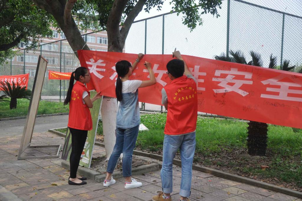 同学们在上下课的路上都积极的参与了这次志愿者活动,现场气氛融洽,大家积极的扫码关注并仔细聆听青协的同学们讲解关于女性防患的知识,并热情的参与到活动中纷纷在横幅上签上自己的名字。