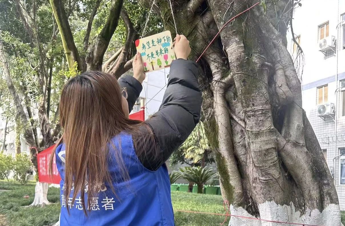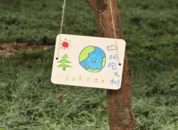 最后,青年志愿者协会统院分会的工作人员把同学们制作的树牌挂在校园树上,这成为校园一道亮丽风景线,时刻提醒我们绿色树木、绿色生活的重要性。植下一棵树,收获万点绿。
