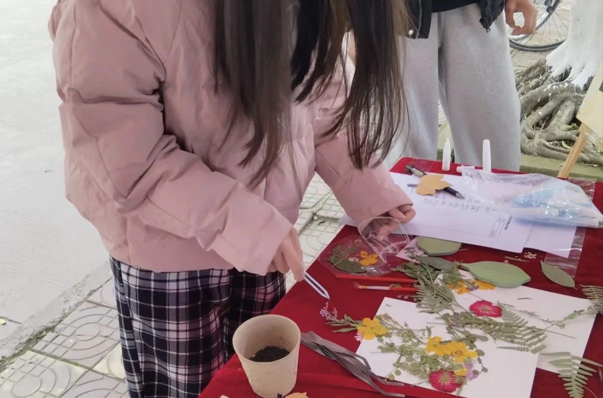在活动现场,同学们用干花制作出超有艺术感的书签,实用又好看,让 “绿色” 时刻相伴。还有同学发挥创意制作树牌,志愿者们把这些树牌挂在校园树木上,传递着习总书记在首都义务植树活动时强调的“全民植树增绿,共建美丽中国”精神。