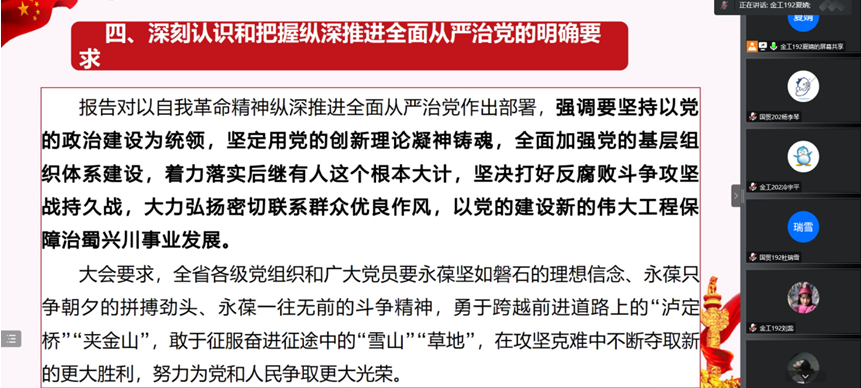 通过本次学习,支部全体党员更加清晰了习近平总书记和四川省委对新时代四川发展的理念和规划,理解了治蜀兴川的重大方向,新时代治蜀兴川的总体要求、重大责任、着力重点和根本保证。这不仅让全体党员看到了四川发展的方向,更让全体青年党员找到了个人未来努力和发展的方向,激发了青年党员的事业心、责任感和斗志,坚定了他们在校时勤奋学习和提升自己,学成后服务家乡,报效家国的理想信念和为之努力奋斗的决心,以实际行动迎接党的二十大胜利召开。