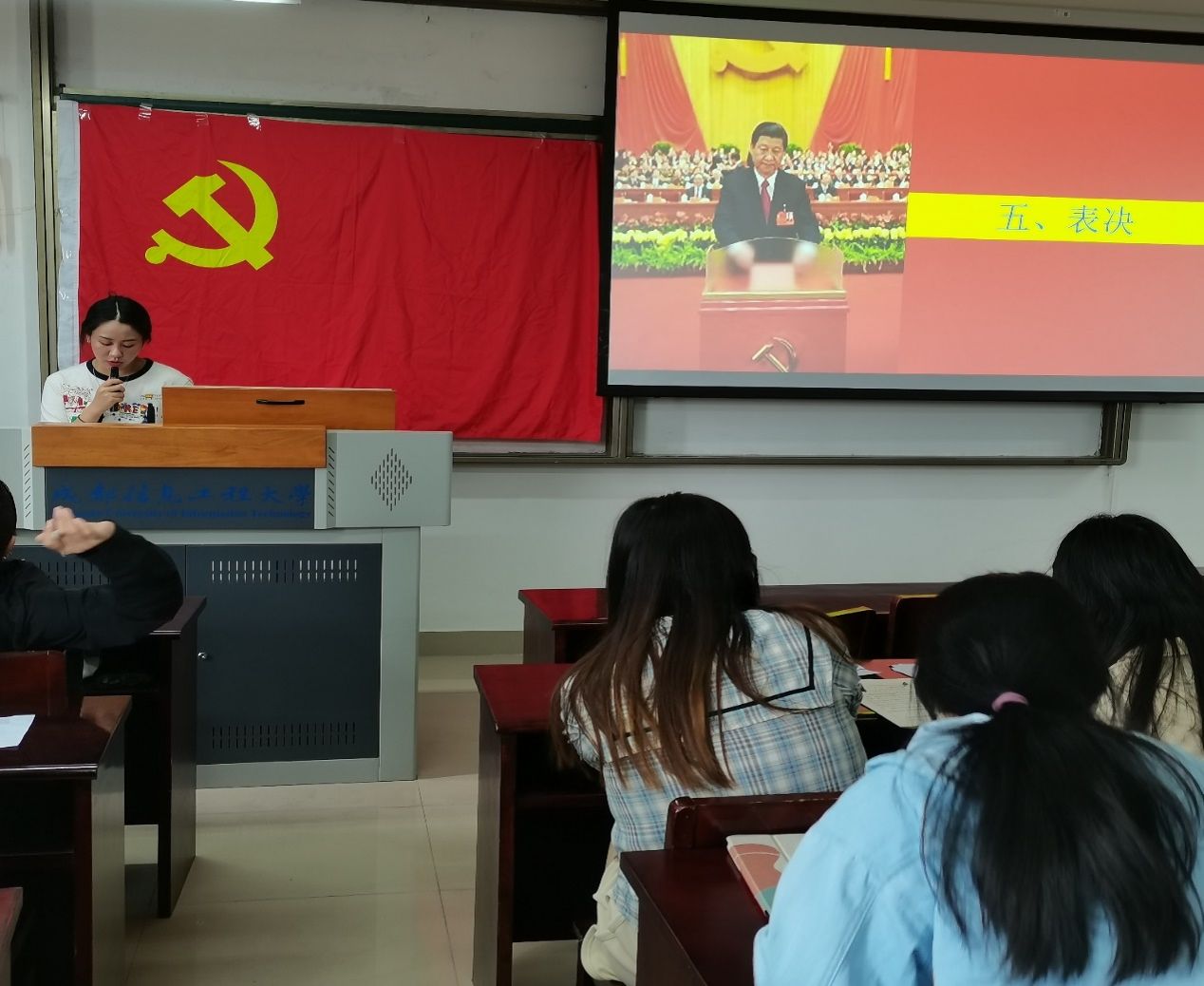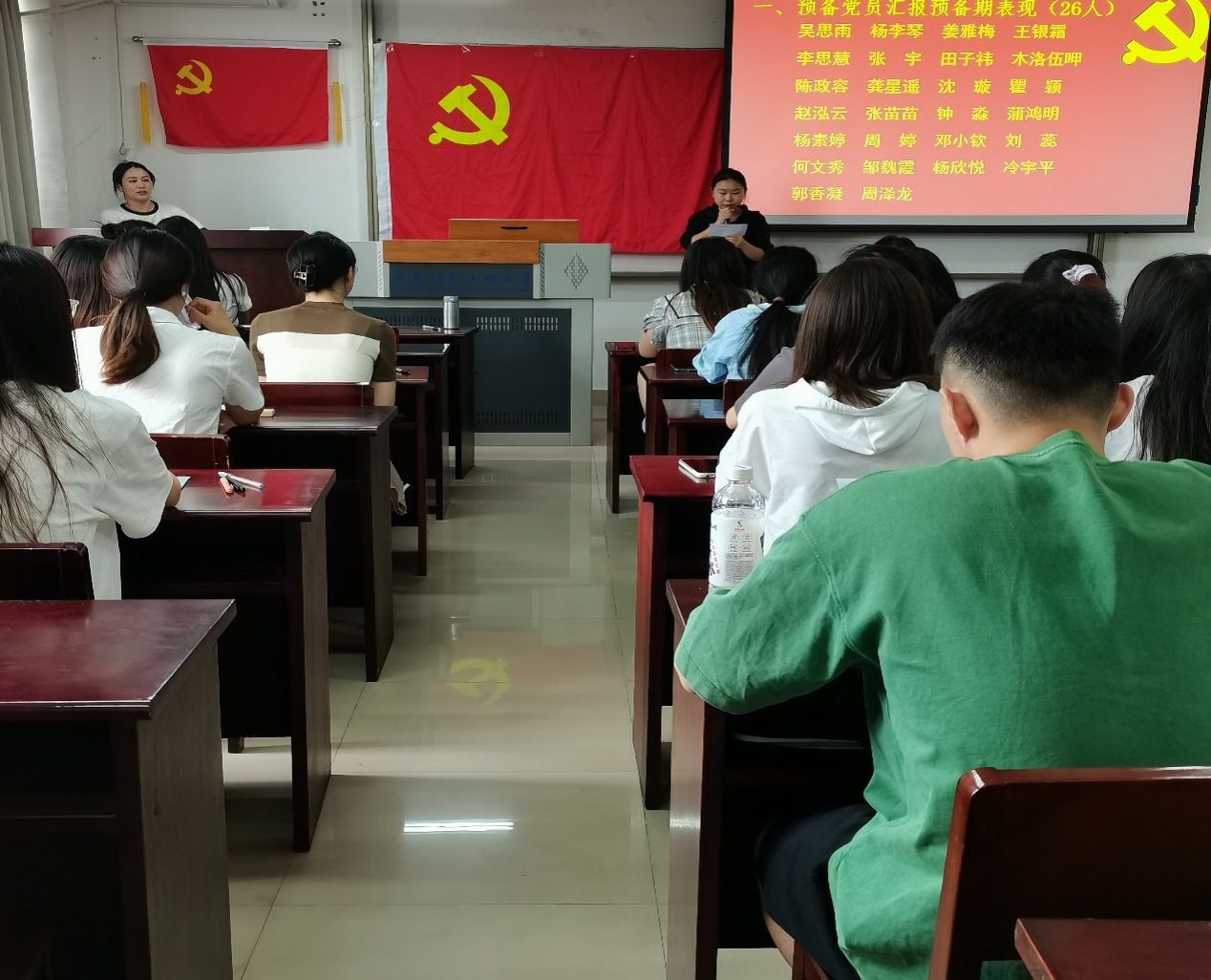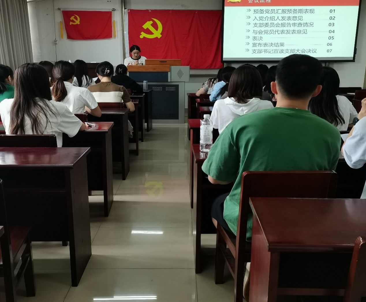 本次会议主要有七项。会议第一项,吴思雨等26名预备党员汇报自己在预备期的个人表现情况,并表明其态度和决心。