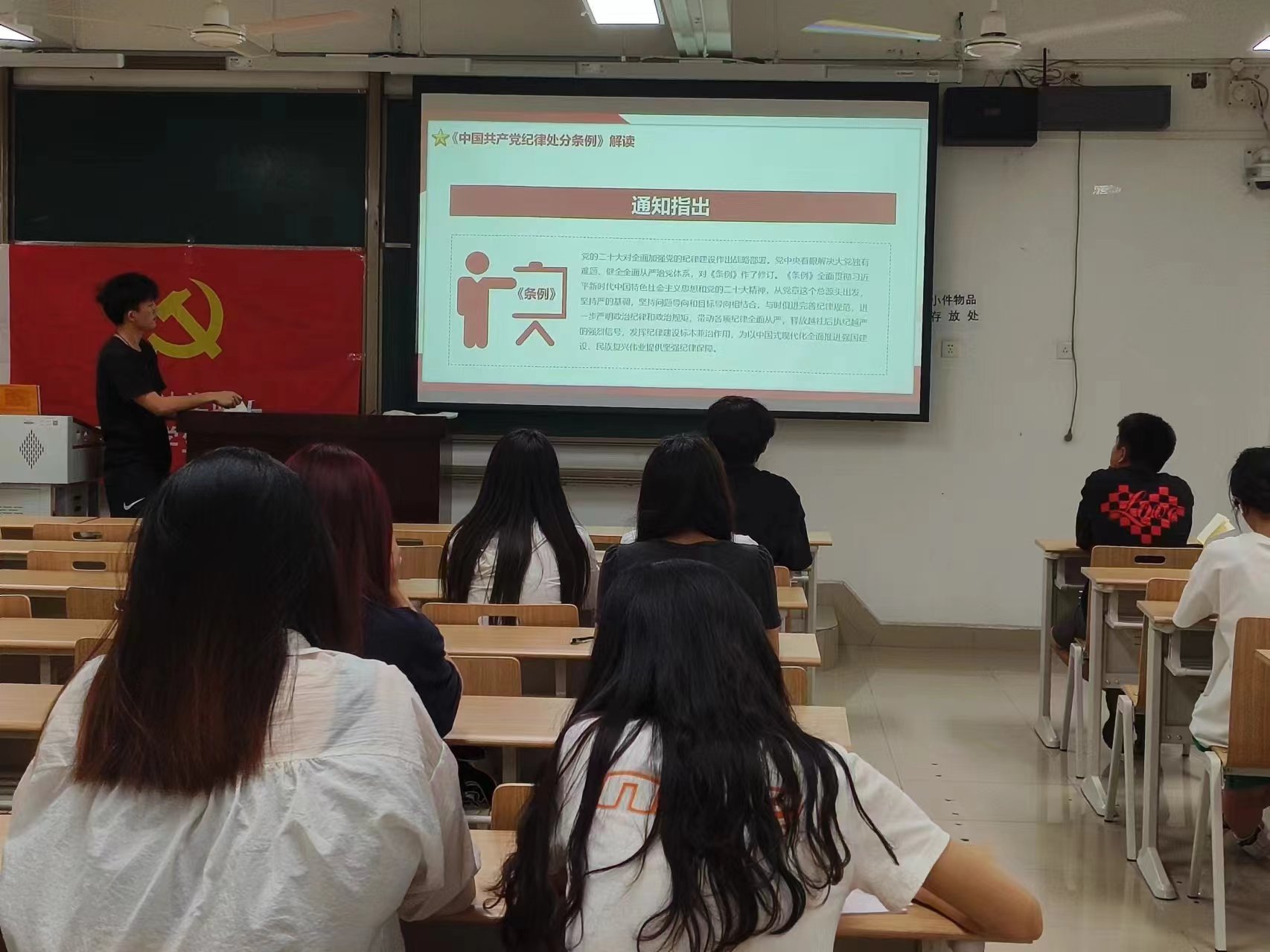 为进一步提升学生党员的纪律意识和思想境界,加强自我约束,成都信息工程大学金融系学生党支部于2024年5月22日(星期三)在2教103教室开展了“强化纪律意识,筑牢思想防线”为主题的《中国共产党纪律处分条例》专题学习活动。