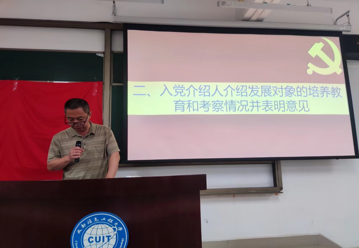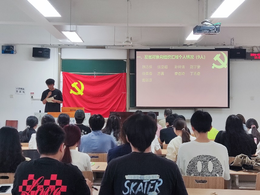 大会第二项,入党介绍人刘强同志介绍发展对象的培养教育和考察情况,并表明9名发展对象符合预备党员的接收要求。